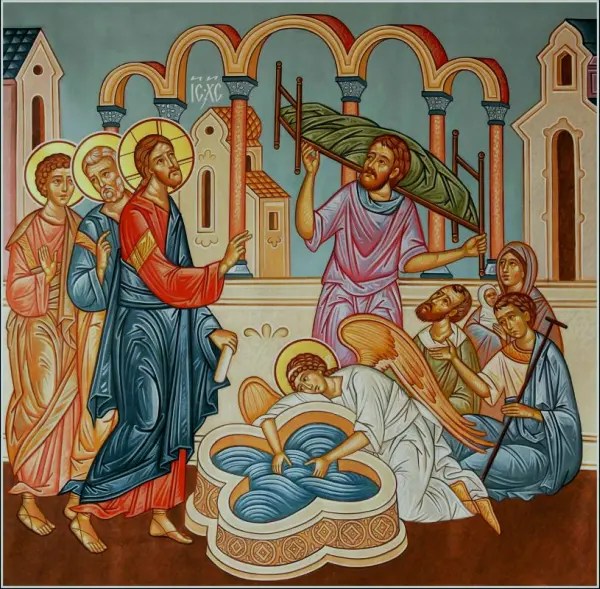 Κατά καιρούς, άγγελος Κυρίου κατέβαινε σε εκείνο το μέρος και τάραζε το νερό. Ο πρώτος ασθενής που έμπαινε μέσα γινόταν καλά από την ασθένειά του· έβρισκε την πολυπόθητη ίαση που περίμενε.